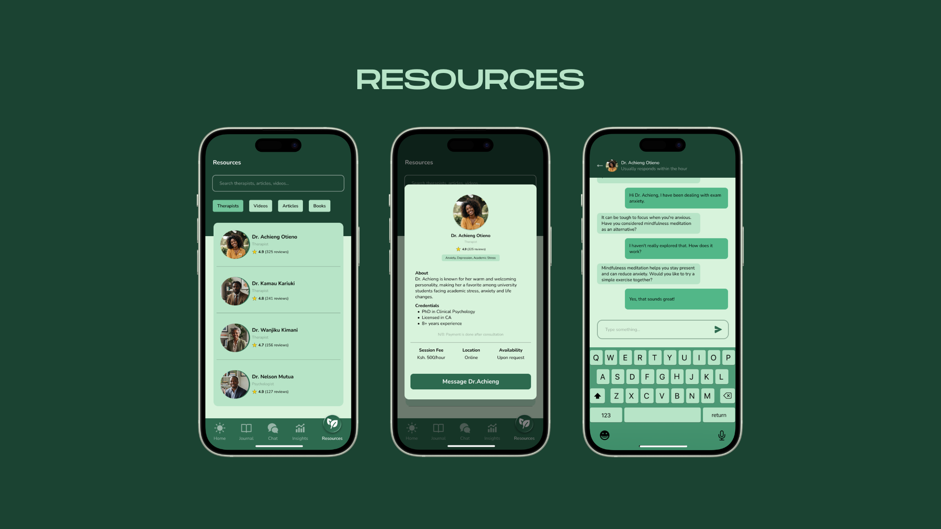 Books, articles, and videos are surfaced based on what you've been writing about. The therapist directory lets users message licensed professionals directly inside the app, removing the friction of finding help outside it.