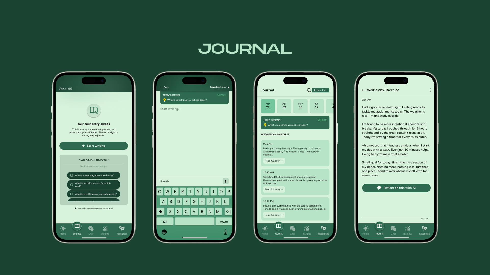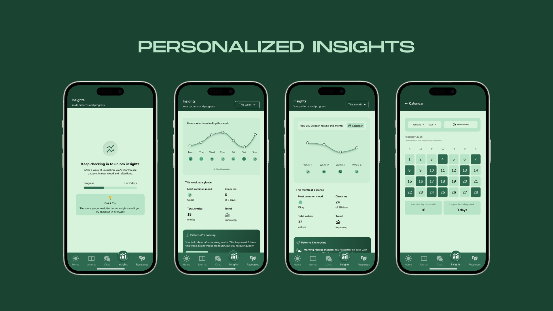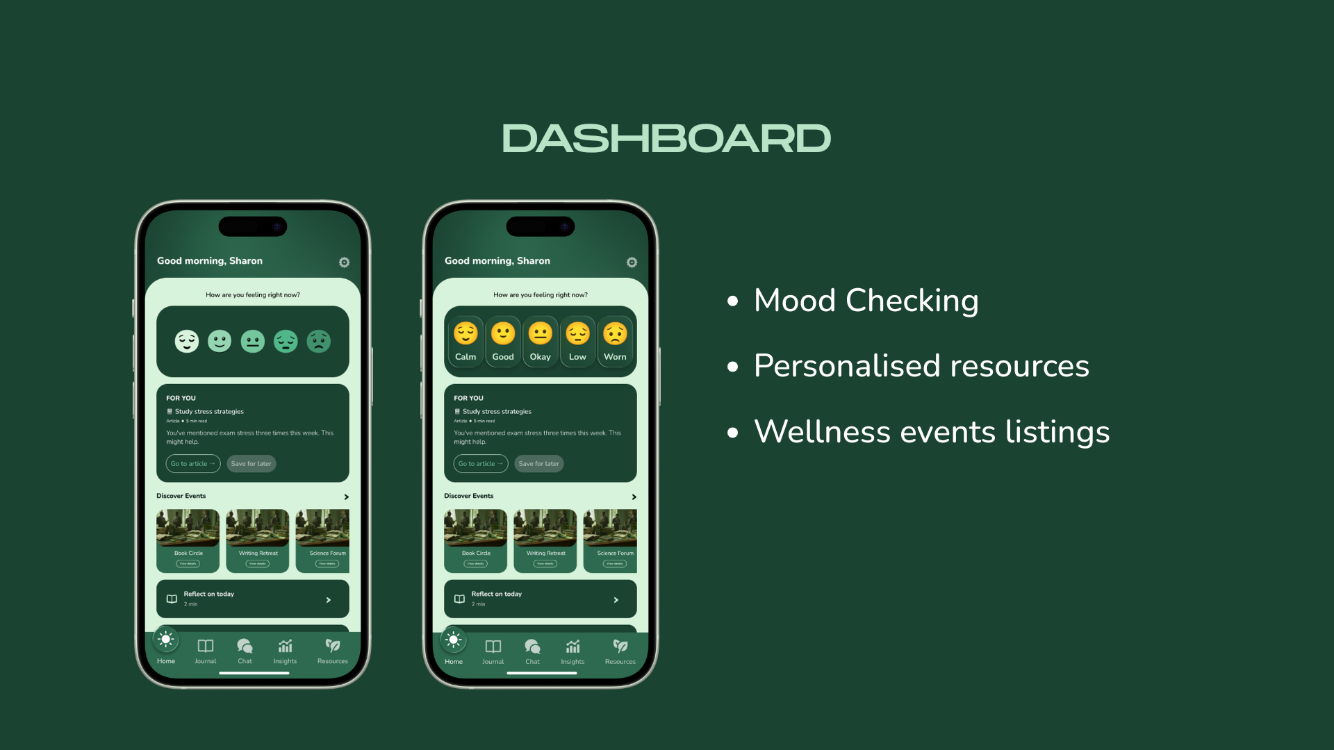 The mood check-in is the hero element. Personalised resource cards surface based on your recent journal entries. Everything responds to you.