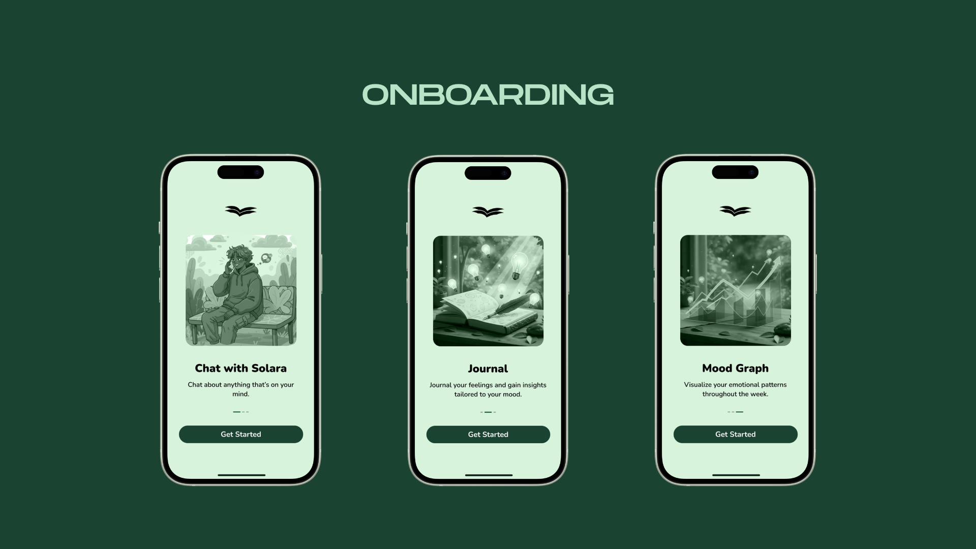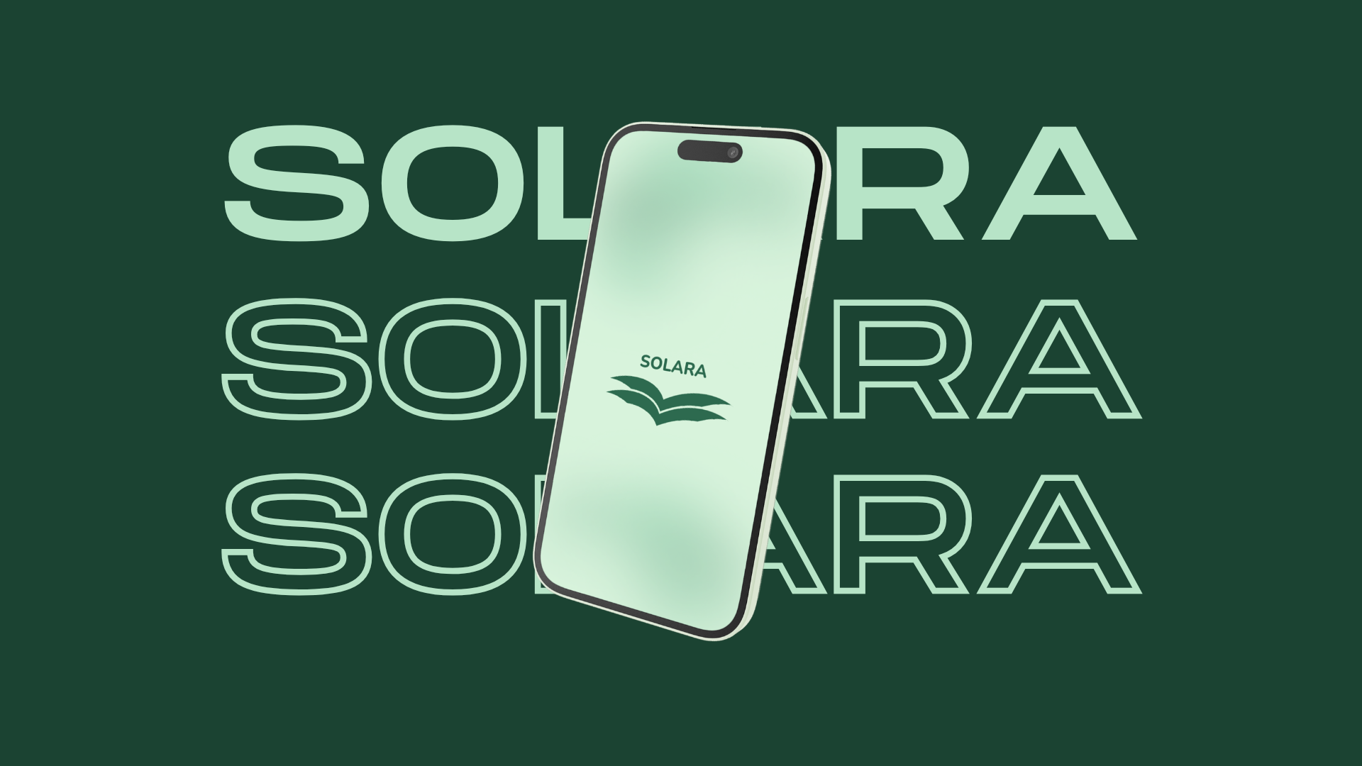 The launch screen establishes Solara's identity, calm, botanical, deeply green. The open-book logomark communicates reflection and growth before a word is read.