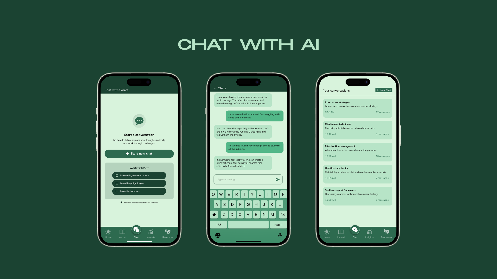 Three truths shaped every decision. The AI Chat had to feel warm, conversation starters like "I am feeling stressed about..." lower the activation energy for opening up. The Journal needed AI that assists without intruding, Solara only offers reflection after you've finished writing. And Insights needed to show narrative, not just data, "You feel calmer after morning walks" is more motivating than any graph.